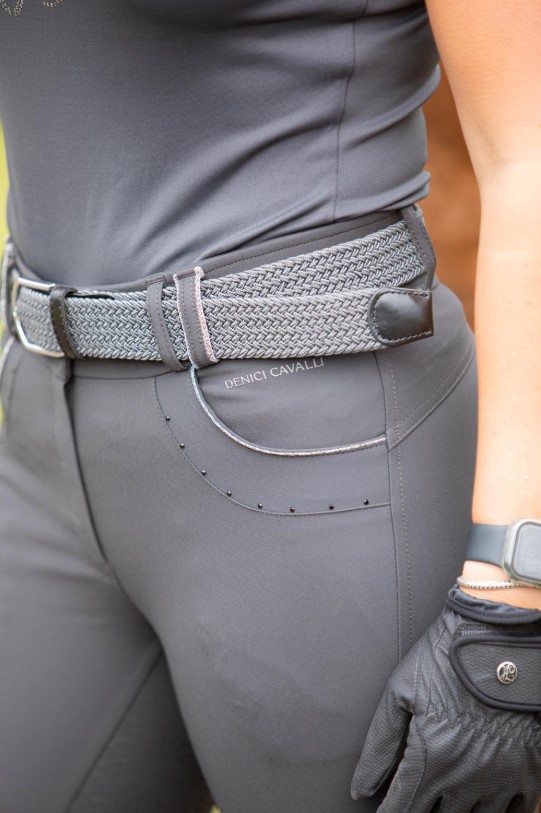 The breeches have two handy pockets, subtly finished with a beautiful glitter piping and refined gunmetal colored crystals. The glitter piping also appears on some belt loops, which provides a stylish and luxurious touch.