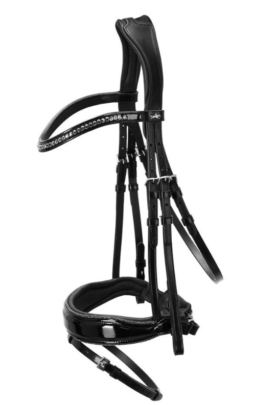 De Schockemohle Stanford Glam is een hoofdstel met een functioneel en sportief design. Dit anatomische gevormde hoofdstel heeft een uniek kopstuk die de druk vermindert bij de gevoelige gebieden zoals het jukbeen en de nek. De neusriem is glimmend met lak en een glitter piping en de frontriem heeft grote kristallen met lak.